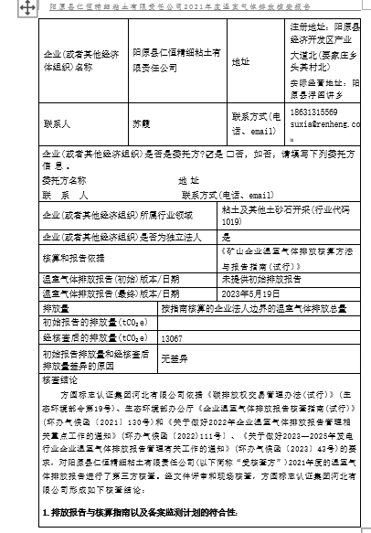 阳原县仁恒精细粘土有限责任公司 2021年度 温室气体排放核查报告